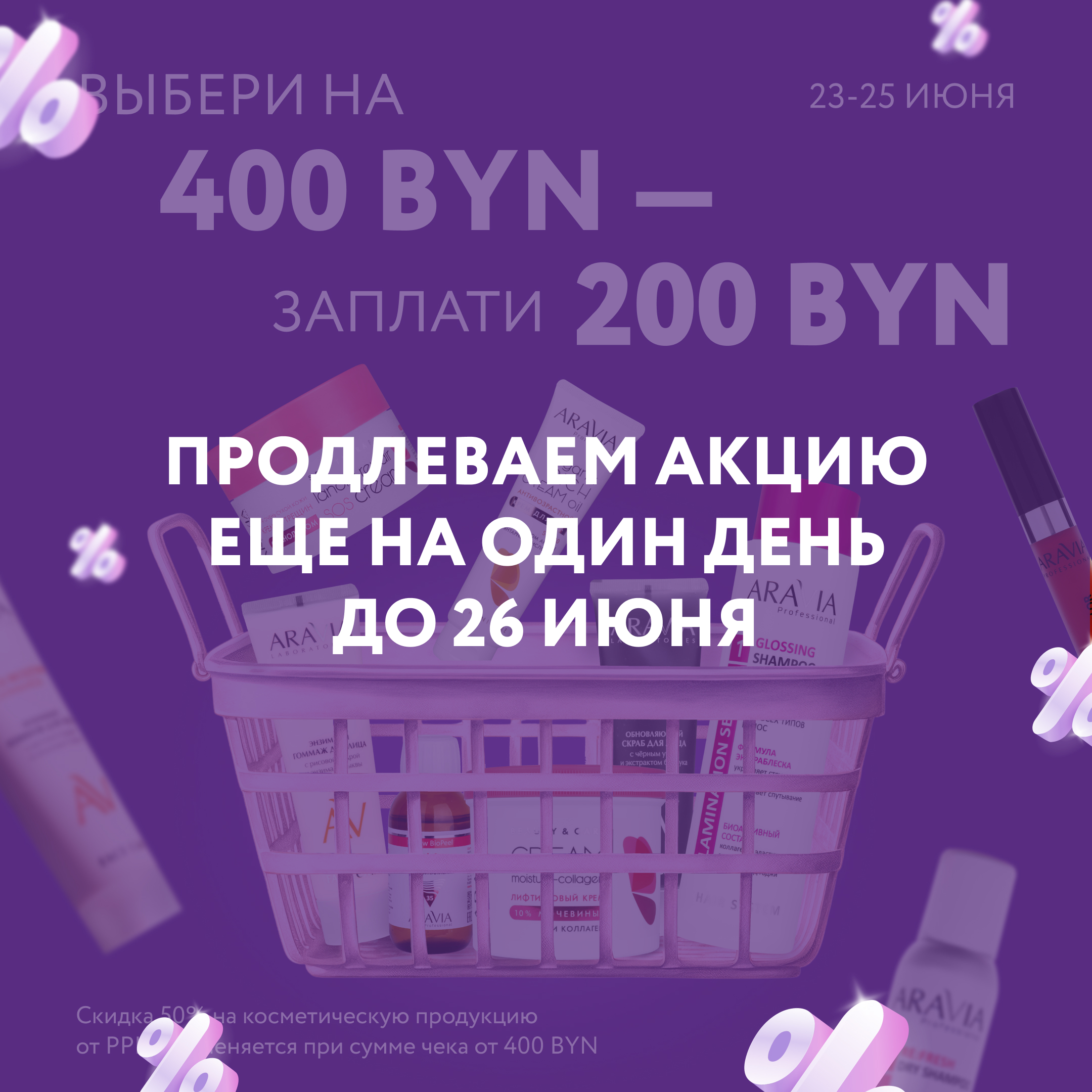 23, 24 и 25 июня 2025 действует скидка 50% от РРЦ на всю косметическую продукцию при единовременной покупке на сумму от 400 BYN.